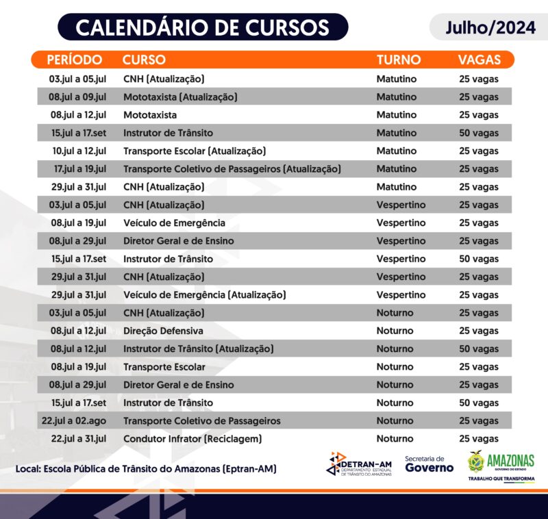 Manaus (AM) – O Departamento Estadual de Trânsito do Amazonas (Detran-AM) informa que no mês de julho a Escola Pública de Trânsito (Eptran) irá oferecer, de forma gratuita, os cursos de Formação de Mototaxista, Instrutor de Trânsito, Condutor de Veículo de Emergência, Condutor de Transporte Escolar e Condutor de Transporte Coletivo de Passageiros, além de Formação de Diretor Geral e de Ensino, Direção Defensiva e Reciclagem de Condutor Infrator.