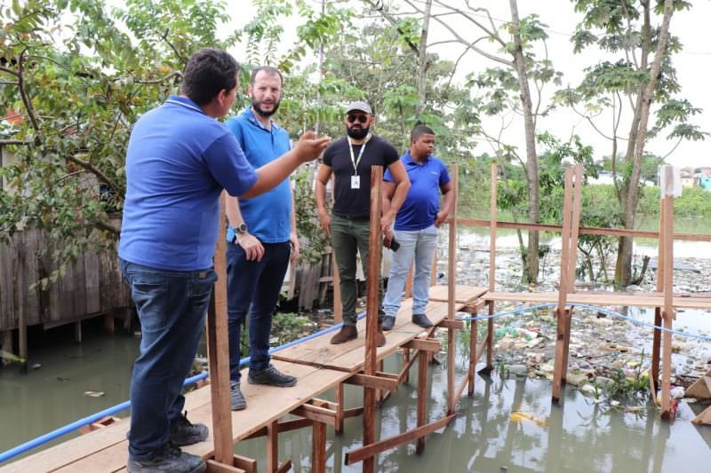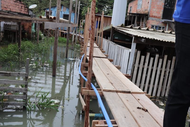 No bairro do São Jorge, na Zona Oeste de Manaus, as equipes da Prefeitura fiscalizaram o trabalho em regiões de palafita que estão sendo impactadas pela cheia. A Águas de Manaus, realiza, desde o começo do mês, uma ação para elevar as tubulações que distribuem água tratada nestas áreas. Com a elevação da estrutura das redes de distribuição, a empresa evita o contato das tubulações com a água contaminada e ainda facilita os trabalhos de manutenção.