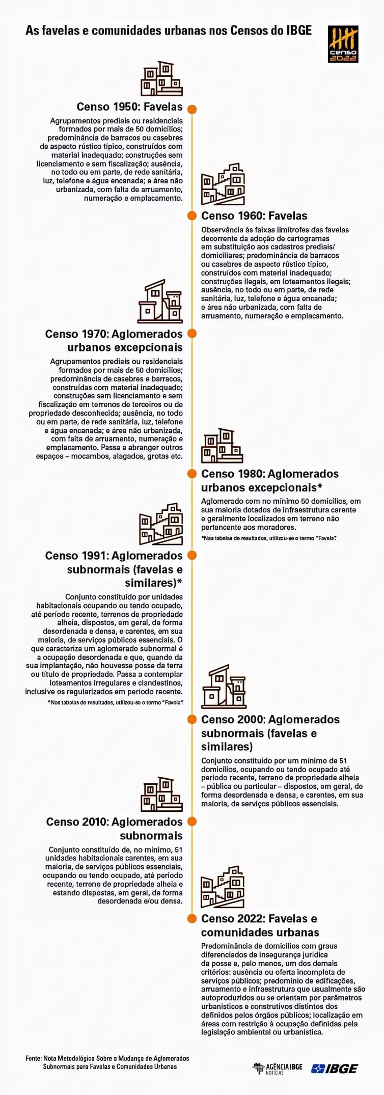 Desde 2003, o IBGE vinha realizando atividades de consulta para revisão da nomenclatura. Em 2021, foi formado o Grupo de Trabalho de Favelas e Comunidades Urbanas. A intenção era subsidiar o aprimoramento do Censo 2022 nas etapas da pesquisa e estruturar um novo processo de consulta para retomar a agenda de reformulação do conceito Aglomerado Subnormal, usado até aquele momento. A discussão continuou e, em setembro do ano passado, foi realizado o Encontro Nacional de Produção, Análise e Disseminação de Informações sobre as Favelas e Comunidades Urbanas no Brasil.