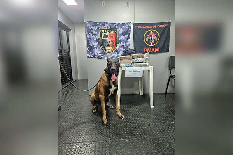Manaus (AM) – Policiais da Base Fluvial Arpão 2 apreenderam, na madrugada desta quinta-feira (11), com o apoio do cão de faro para narcóticos Kratos, 10 quilos de entorpecentes avaliados em cerca de R$ 200 mil. A apreensão, realizada em Barcelos (a 399 quilômetros de Manaus), é a primeira da nova base fluvial, que foi entregue pelo governador Wilson Lima no dia 3 de janeiro.