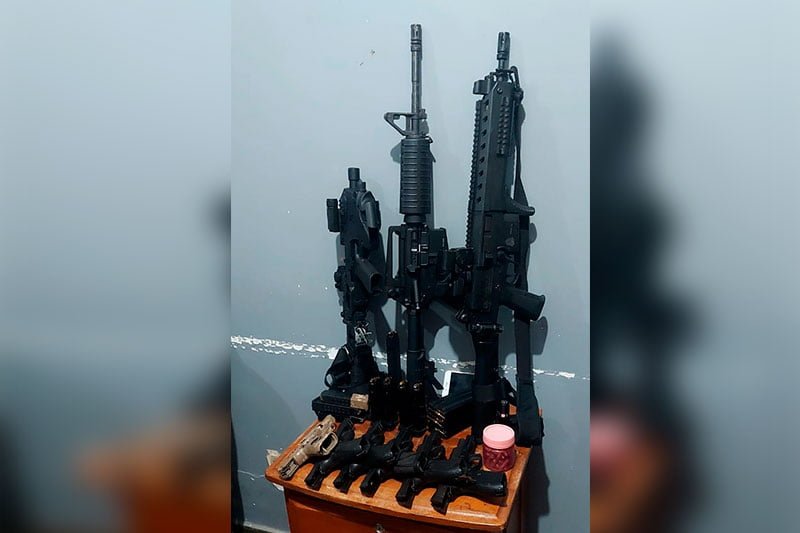 Com o grupo, policiais do 9º BPM apreenderam capas de coletes balísticos, carregadores com munições, um veículo Onix branco, de placa PHZ-7C16, pistolas, fuzis, submetralhadora, munições de fuzil, munições de pistolas, capacete e celulares.