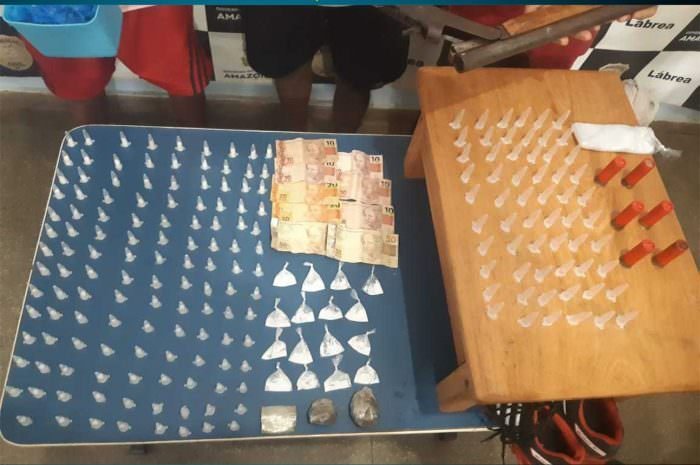 No município de Lábrea (distante à 701 quilômetros de Manaus), policiais militares receberam uma denúncia anônima informando a venda de material ilícito no beco do Tauaruhã. A guarnição foi até o local indicado para apurar a denúncia, onde foram encontrados três homens comercializando entorpecentes. Com o trio foram apreendidas 143 porções de drogas, entre maconha e cocaína, uma espingarda calibre 16, seis cartuchos de munições intactas e 60 pinos plásticos vazios, além de R$ 190 em espécie. Os suspeitos e o material ilícito foram apresentados na 6ª Delegacia Interativa de Polícia Civil de Lábrea (DIPCL), onde foram flagranteados por tráfico de drogas.
