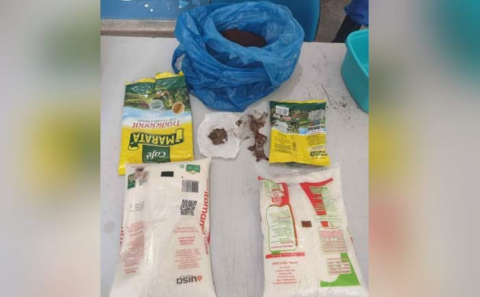 Durante procedimento padrão de revista no material, foi encontrada uma porção média de maconha tipo skunk em um pacote de café, que estava violado.